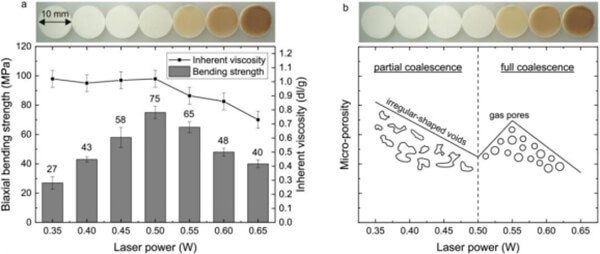 Figure 8. Circular SLS samples (diameter 10 mm, thickness 1 mm) made from PLLA-1.0-based composites: (a) Relationship between biaxial flexural strength, intrinsic viscosity, and laser power; (b) Qualitative behavior of microporosity versus laser power.