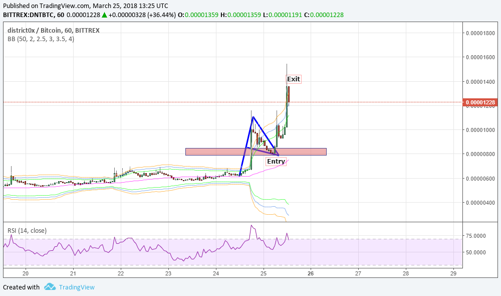 This was the chart I posted at time of my entry. As you can see $DNT has made a big impulsive move and now it has formed a bullish flag. This is very common pattern in cryptocurrencies, whenever a coin breaks with big impulsive move, it pull backs and wait for some time before making next impulsive move.