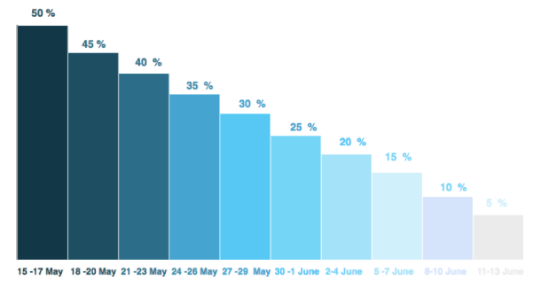 Daca nu stiti ce inseamna bonificatiile,o sa dau un exemplu daca exista o camapnie de recompense care are 40% bonificatie pentru prima zi asta inseamna ca cei care cumpara moneda in prima zi sa zicem de 1 btc va primi moneda de 1,4 btc,cu 40% mai multa si dupa cum vedeti pe acea imagine pana si ultimii investitori o sa aiba o bonificatie de 5% ,bonificatia scazand cu 5% la fiecare 3 zile.