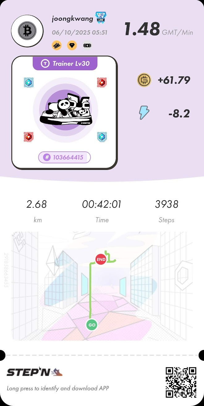 STEPN Solana 2025/10/06steemCreated with Sketch.joongkwang (67)in #blog • yesterday STEPN은 엄청난 규율과 헌신이 필요합니다. 정말 헌신해야 하죠. 저는 주말에 가족과 시간을 보내고 휴식을 취하기로 했습니다. 정말 필요했던 것 같아요. 지난주는 정말 지쳐서 걸을 용기가 나지 않았습니다. 오늘 아침 GST 수입 한도에 도달하기 위해 걸었습니다. 그렇게 할 수 있어서 정말 다행입니다. #stepn #solana #sol