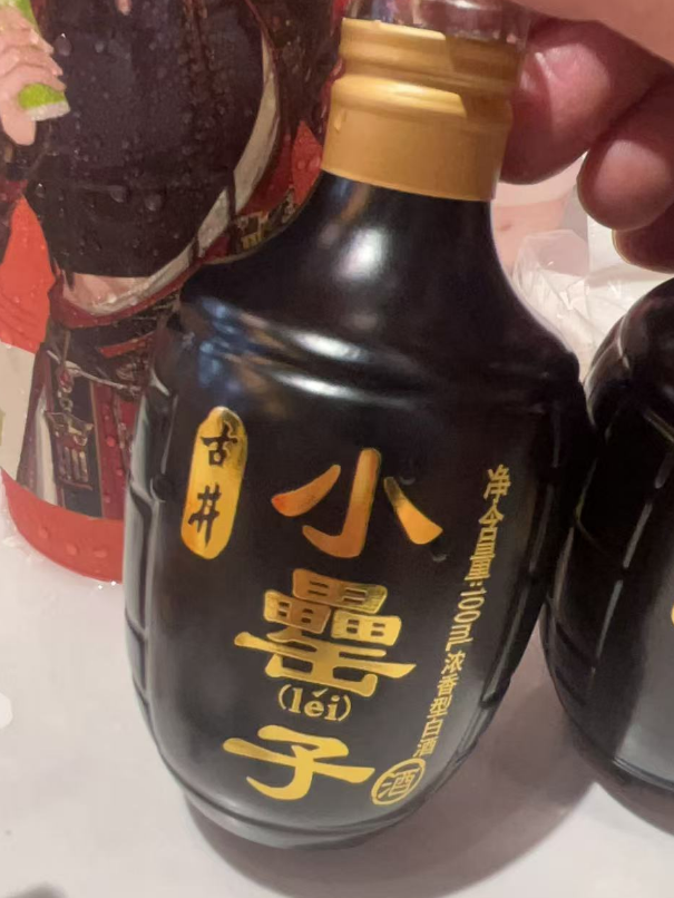 手中握着一瓶古井小罍子酒,墨黑的瓶身泛着沉稳的光泽,金色的字体与瓶盖相互映衬,精致又典雅。“小罍子” 三个字带着点俏皮,旁边标注的 “léi”,更是添了几分生动,仿佛在轻声诉说着酒文化里的趣味。