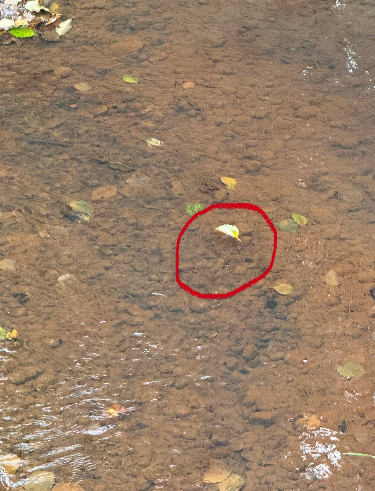 …has a lot of sediment in its bed however the water is crystal clear. You can see the leaves that have sunk and the one (I circled it) that was floating downstream.