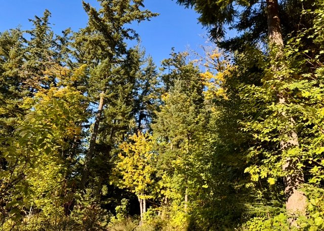 As you can see from the first photo-the skies couldn’t be any bluer and there wasn’t a cloud anywhere! There was some wind though, but it just sent all the leaves to dancing in the air and on the ground. As we came to the 90 degree curve in our road, we got hit full force with the first Nor’easter for the year. With all those 80 acres of trees gone, it sets up quite the wind tunnel-a precursor to the winter to come! 🥶