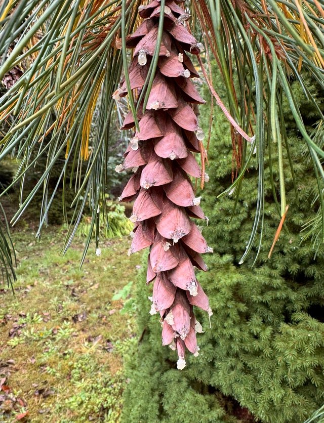 A pine cone hanging from one of two weeping white pines. The trees used to be sort of smallish, however now, they are literally weeping all over the place! 😁