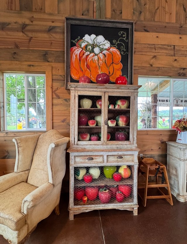 There was live music and food. This was one corner of the inside of the barn where hot and cold cider, hot coffee and doughnuts were served.