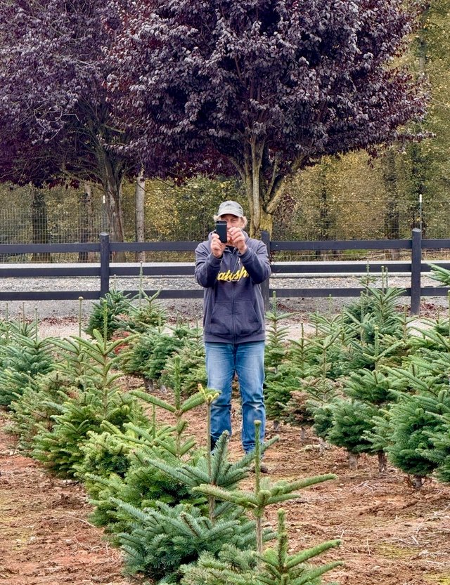Stoney Ridge Farm morphs into a Christmas tree farm in late November and into December. Part of the tractor ride meanders around that part, but close to the animals, the baby Christmas trees that won’t be for sale for a few years are right there. I caught @silvertop checking them out.