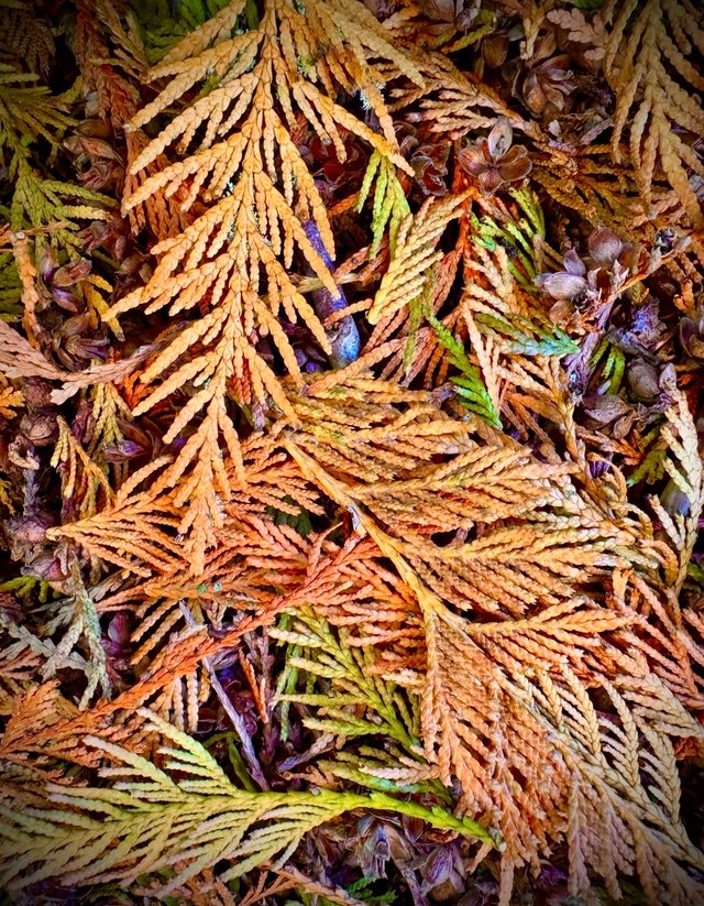 The cedar trees and the pine trees, although evergreen, still drop needles and boughs. They turn a golden brown and hang onto the trees until rain or wind knocks them off.