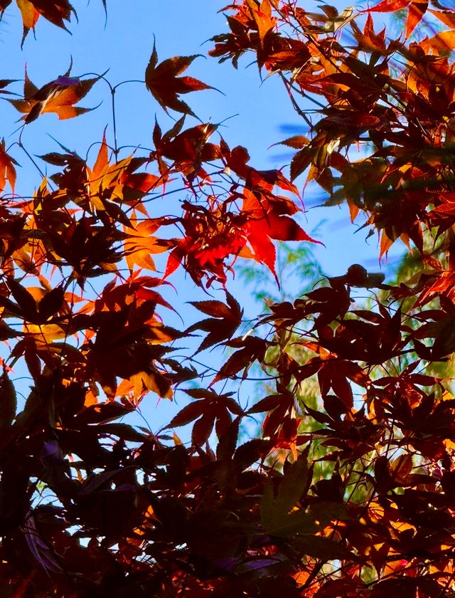 The blood good Japanese maple has not gotten its crimson leaves for fall just yet. With the sun shining through them, you might think so…….