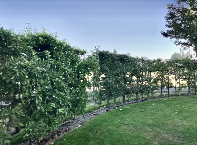 The homeowner worked very hard to “train” his Apple trees into a trellis…..
