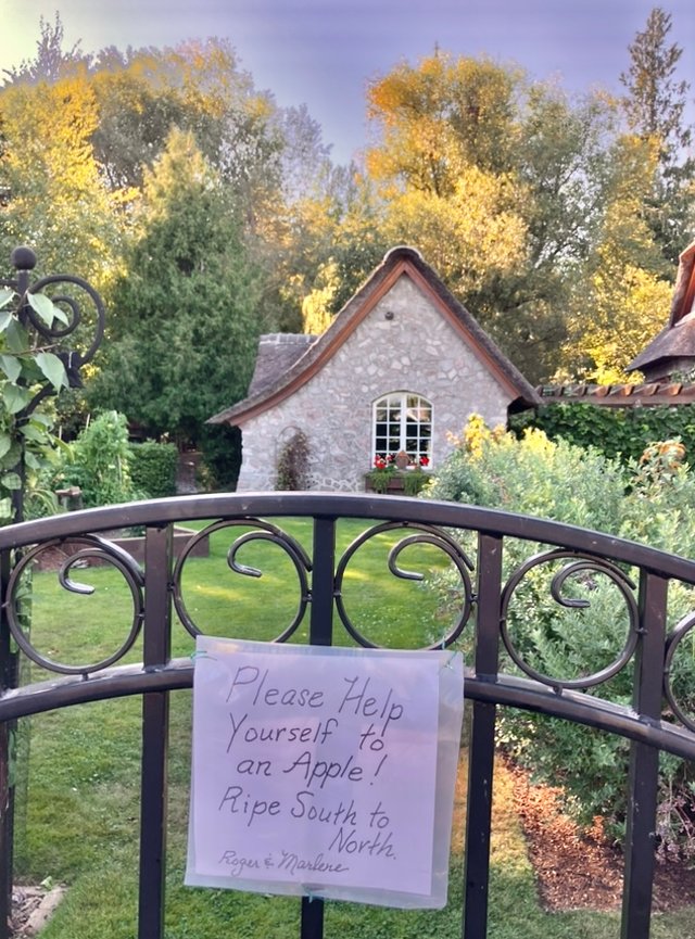 “Liz…… look, they put up a sign on their gate, to come inside, and pick a delicious ripe Apple!”