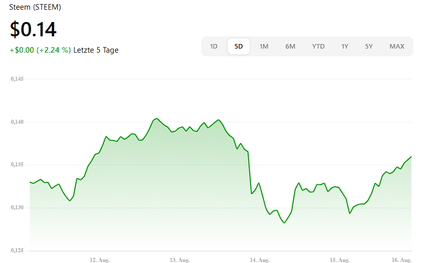 Steem notiert aktuell bei rund 0,136 USD. Die heutige Spanne lag bislang etwa zwischen 0,129–0,136 USD; der Wochenverlauf zeigte mehrere Tests der oberen 0,13er-Zone. (Siehe Chart-Widget.)