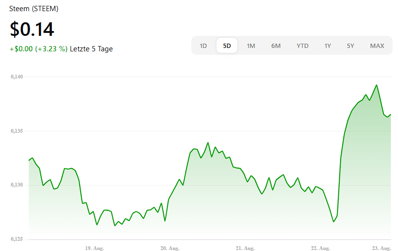 STEEM handelt aktuell bei ≈ 0,1366 USD. Intraday lag die Spanne zuletzt grob zwischen ~0,126–0,140 USD – im Chart-Widget oben siehst du die laufende Woche und die fortgesetzte Seitwärtskonsolidierung im oberen Bereich der jüngsten Range.