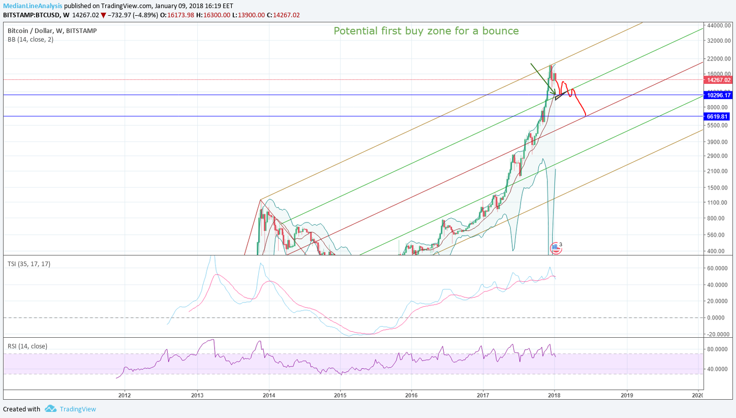 There's a cluster of strong resistance beetween 5900 to 4700. More precisely at @∼5900, @∼5400, @∼4700. I see price going down to that level in 2-3 months. At those prices we should get a significant bounce. (Kinda like we've seen it happen from 2013-12 to 2014-04, 3 drives down and then a big bounce). After that we'll need to re-evaluate the situation.