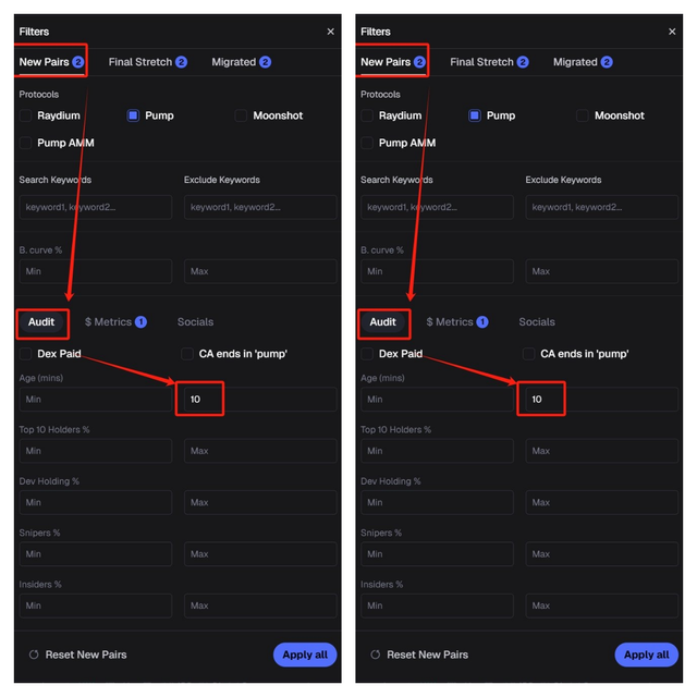 On the settings page, choose "New Pairs" to filter internal market data for recently created tokens—typically projects launched within seconds or minutes. Key recommended filters include setting a time limit (maximum 10 minutes) and a minimum market cap (6K). Newcomers can replicate the setup illustrated in the image below: