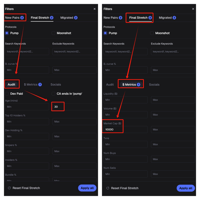 On the settings page, select "Final Stretch" to filter pump data for tokens close to full launch. These are early-stage PVP projects with initial volume that may complete their rollout. Set a time limit (maximum 30 minutes) and a minimum market cap (10K). Beginners can adopt the configurations shown in the image below: