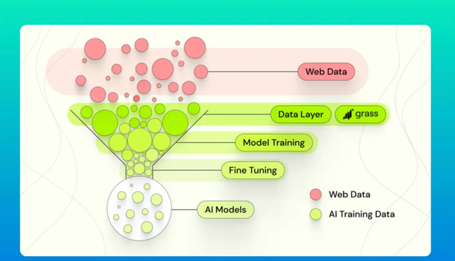 Grass 利用用户闲置网络资源——主要是上传带宽和真实 IP——并通过 Wynd 公司销售给 AI 公司和实验室用于模型训练,这需要大量网络爬取和数据收集。