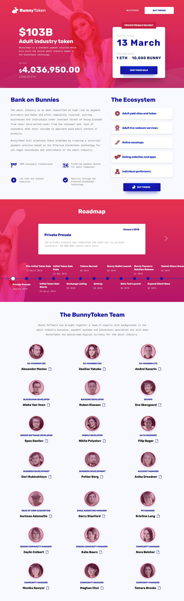 BunnyToken.com is a payment solution for the $103 billion adult industry. Using the blockchain technology we will ensure all businesses and individuals related to the adult industry have a safe and reliable payment method through which consumers can purchase content and products 100% anonymously.