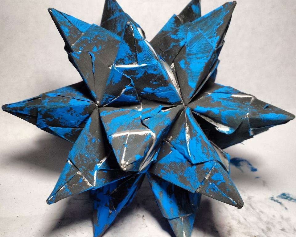 esta pieza fue el primer origami que pinte como podemos ver errores se aprende al pintarlo me di cuenta que quedaba muchos espacios en blanco por los pliegos del papel a los que la pintura no llegaba , pero vemos como la combinación del negro y el azul llena de vida este origami
