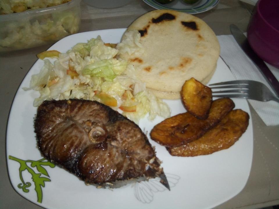 En esta foto está acompañado de tajadas, ensalada y arepas.
