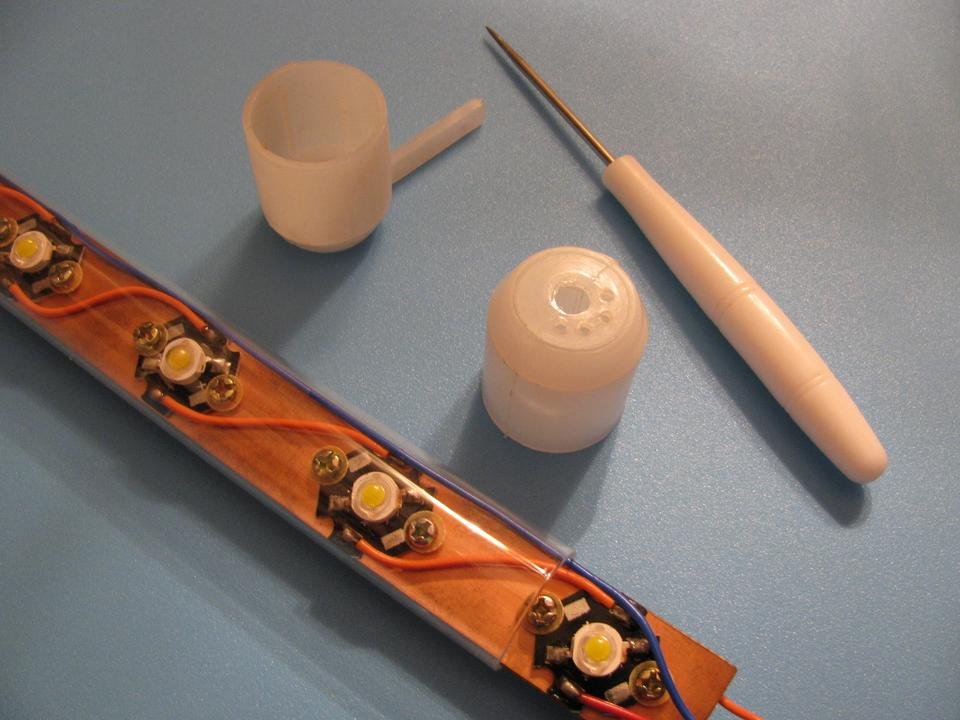 Перед установкой светодиодов можно зачистить фольгу до ярко-золотистого блеска обычным ученическим ластиком, будет красиво. Хотя со временем она потом потускнеет.