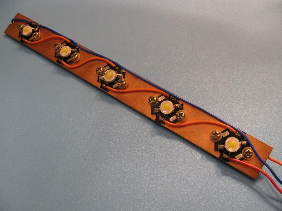 На полоске, предварительно просверлив в ней отверстия, с двух сторон установим по 5 светодиодов, зафиксировав их болтиками M3.