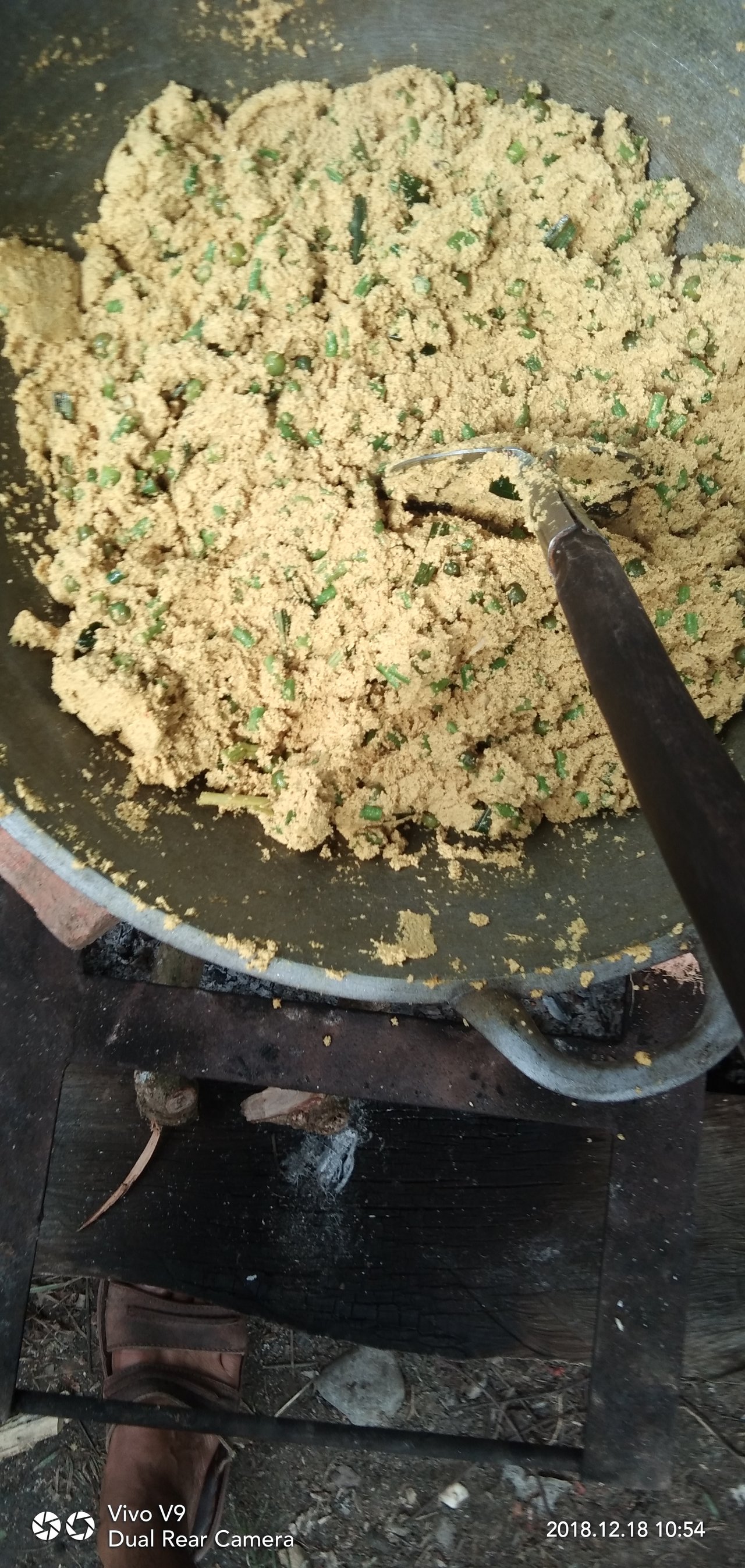 Asam ini diracik dengan beberapa bumbu dapur, diantaranya ialah daging buah kelapa yang diparut, terong, kacang panjang, cabe dan bumbu lainnya.