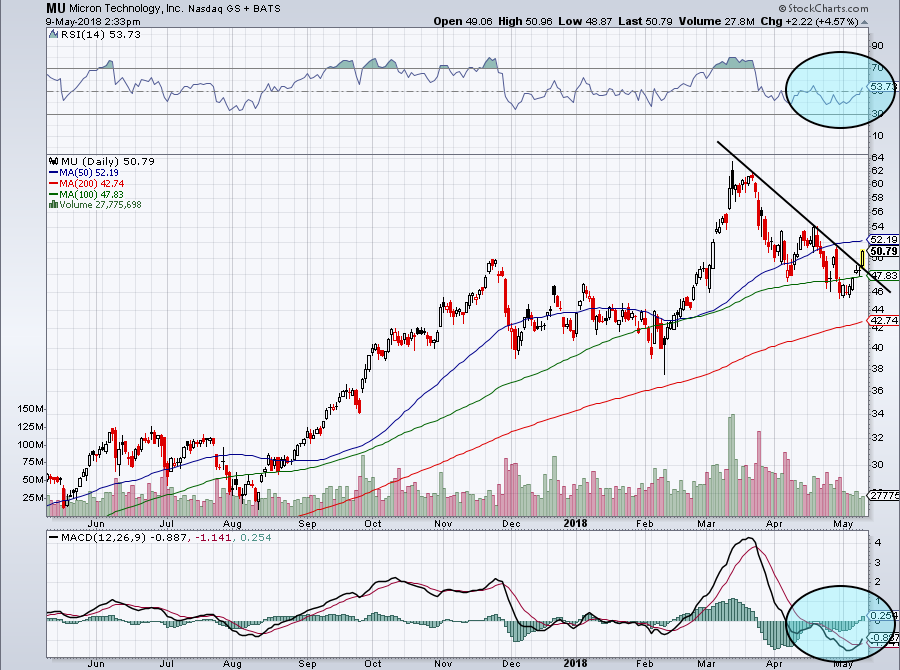 Now though, Wednesday’s 4.5% rally has thrust MU back above downtrend resistance. The momentum-measuring MACD and overbought/oversold indicator that is the RSI (both in blue circles) bode well for bulls as well.