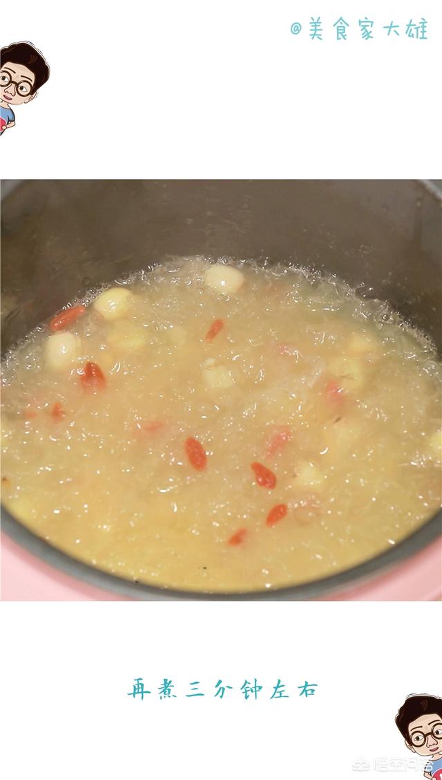 四、注意事项:加水,体积是食材的两倍左右。按下电饭锅运作开关,直至跳至保温。(因为银耳羹特别容易溢锅,所以要视自家电饭锅大小,酌情减少食材和水的用量,在煮涨以后,可以开盖来煮,人不要离开旁边,方便照看。这是用任何锅煮银耳羹都需要注意的。)