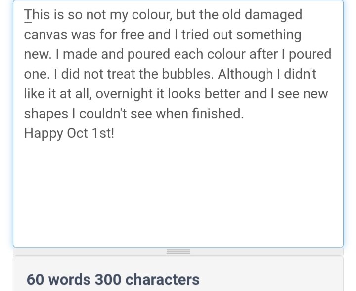 This is so not my colour, but the old damaged canvas was for free and I tried out something new. I made and poured each colour after I poured one. I did not treat the bubbles. Although I didn't like it at all, overnight it looks better and I see new shapes I couldn't see as I was finished.