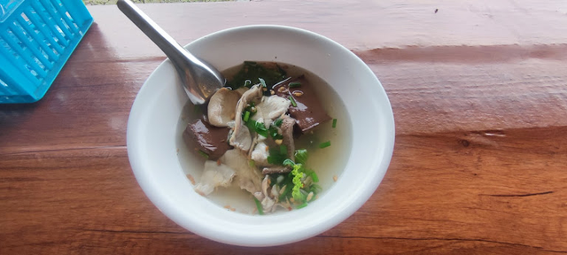 Behold the champion of Thai mornings: Kao Lao Lued Moo (Pork Blood Soup, without the noodles) served with a simple bowl of steamed rice. From a humble roadside stall, a steaming bowl of magic emerges. The broth, a deep, aromatic elixir, is a bustling party of ingredients. We're talking tender slices of pork, perfectly cooked liver, crunchy stomach, bouncy meatballs, and the star of the show—delicate, silky cubes of pork blood that melt in your mouth. The whole thing is perfumed with fried garlic, fresh greens, and a peppery kick that wakes you right up.