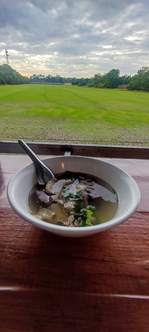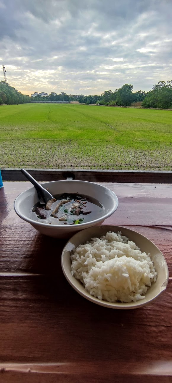แต่ความมหัศจรรย์ที่แท้จริงมันอยู่ตรงนี้ครับ...การตักน้ำซุปรสชาติล้ำลึกเข้าปาก ตามด้วยข้าวสวยร้อนๆ สักคำ แล้วเงยหน้าขึ้นจากชามเพื่อมองไปยังทุ่งนาสีเขียวที่ทอดยาวอยู่เบื้องหน้า...มันคือซิมโฟนีแห่งประสาทสัมผัส! พลังความอร่อยจัดจ้านของเกาเหลาตัดกับความสงบงามของทิวทัศน์ได้อย่างลงตัวที่สุด มันเป็นมื้ออาหารที่ให้ความอบอุ่นจากภายในสู่ภายนอก ไม่เพียงแต่เติมเต็มร่างกาย แต่ยังช่วยบำรุงจิตวิญญาณอีกด้วย นี่ไม่ใช่มื้อเช้าธรรมดา แต่มันคือช่วงเวลาแห่งความสงบสุข คือสิ่งที่ย้ำเตือนเราถึงความสุขเรียบง่ายในชีวิต