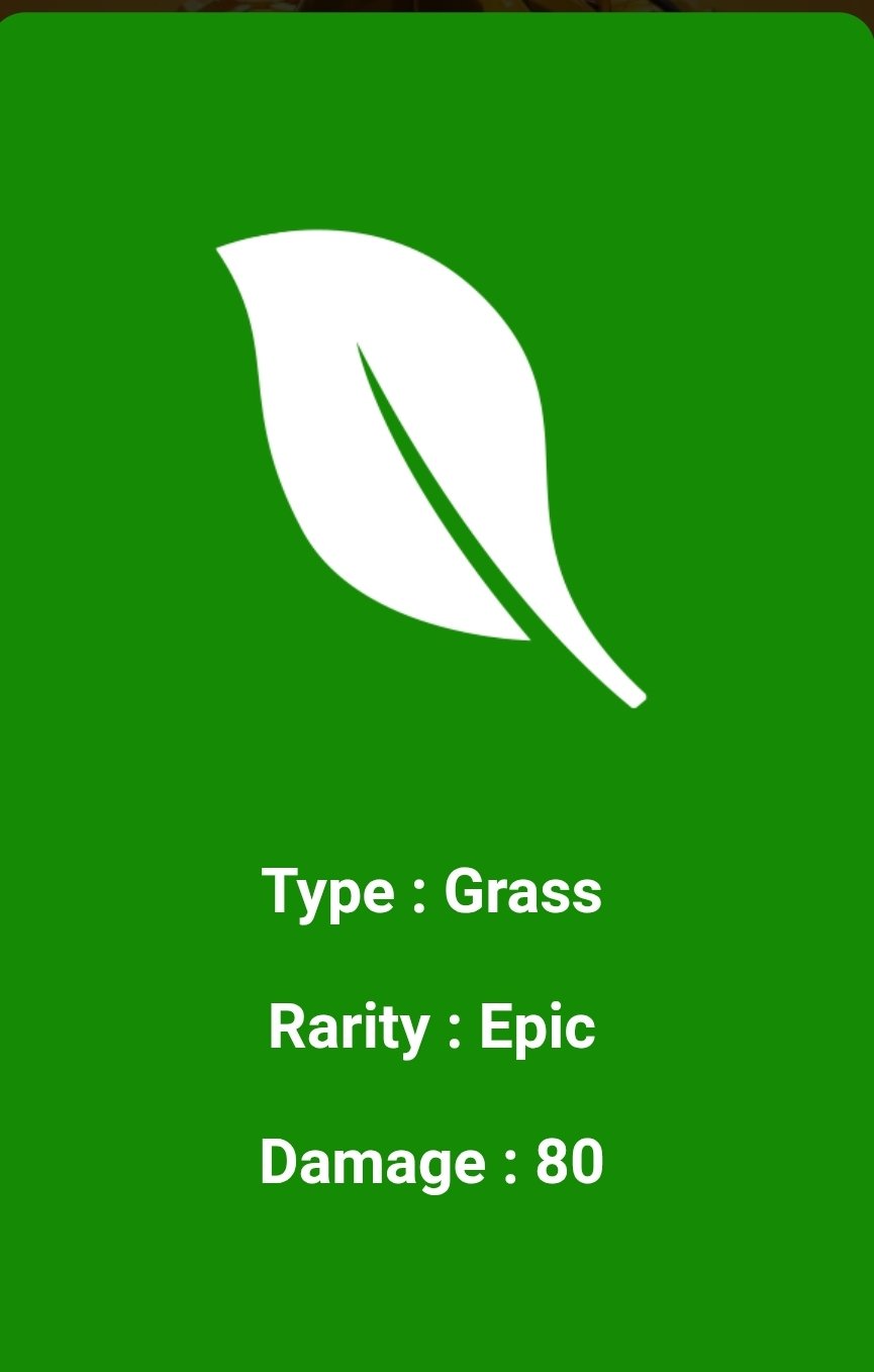 This green colored card you see is a Grass type, 1.5T Epic, and has a damage of 80. This is a very wonderful card. Its damage is very high, it is so much damage that hardly anyone will have it. This is a very important card. Its damage will help a lot in defeating the monster and I will be able to give maximum damage to the monster.