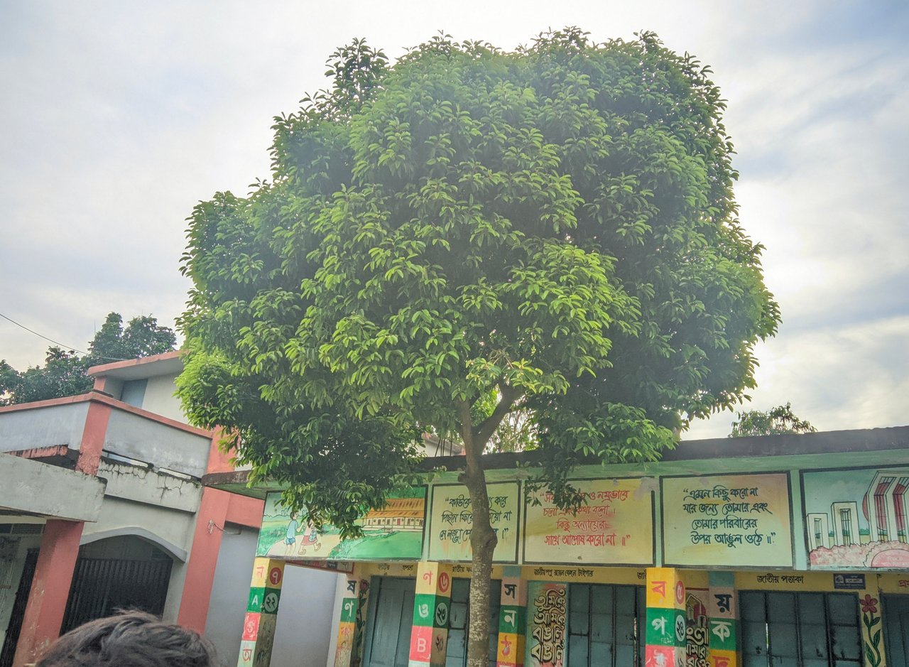 A littleSchool or educational institutions. In front of it is a huge tree, whose green leaves and dense stems are like green clouds on the head. On the walls of the school room, all the pictures are painted and writing different educational words, which makes the mind calm. Not only does this tree give a cool shade, it also gives people to the market to breathe a little comfort. Children may play in this plant or take a little rest in the study gap.