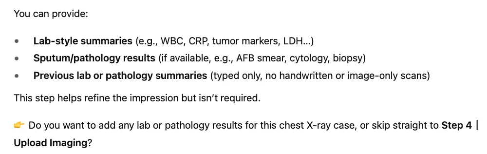 This step is not required, but when included, it enhances the realism of the simulated report by combining imaging findings with clinical and laboratory clues — just like in actual multidisciplinary practice.