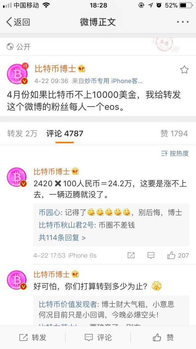 A guy in China who made a bet on Chinese SNS-Weibo that he will give 1 EOS to everyone who reposted and followed him if BITCOIN doesn't hit 10K USD by the end of April.