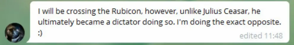 他在交出 ENU 系统超级权限的时候,将自己比作越过了卢比孔河却没有称王的凯撒,著名翻译家熊越将其翻作「纵越卢比孔,不做凯撒王」。