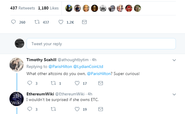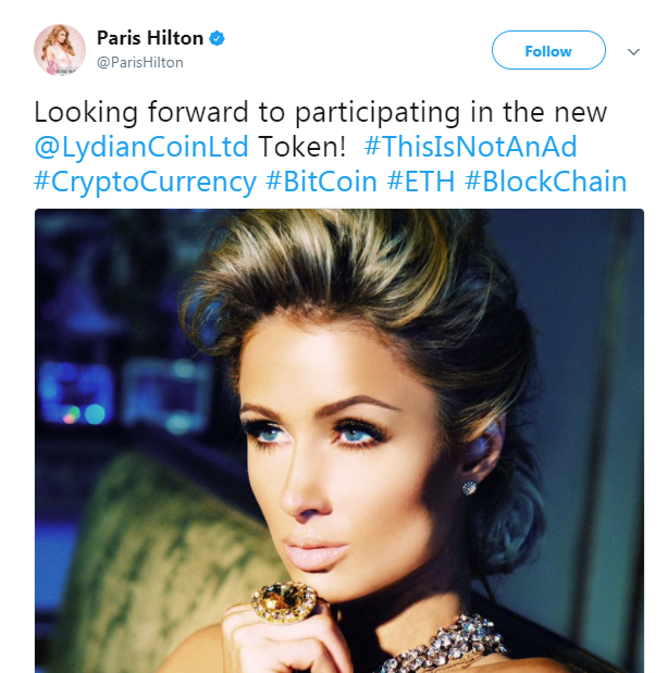 今天打开默默潜水的推特(只关注区域链的一些技术贴),发现大家欢乐的砸锅了,白富美 帕丽斯-希尔顿 高调关注一个啥叫Lydian的新币(https://lydian.io),估计也是为了ICO造势。