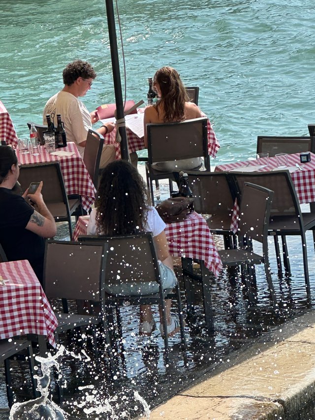 水城还是比较特别的地方,有的餐厅就设在水边。有客人在吃饭的时候,得脚翘起来才不会被湿到脚,是一道特色,也很无奈。