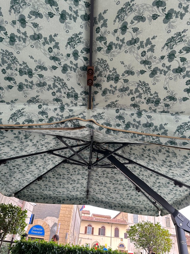 连这“大雨伞”都是很雅致的印花图案。某生点了他喜欢的old fashion。我就点了橙汁。我们边喝边聊。