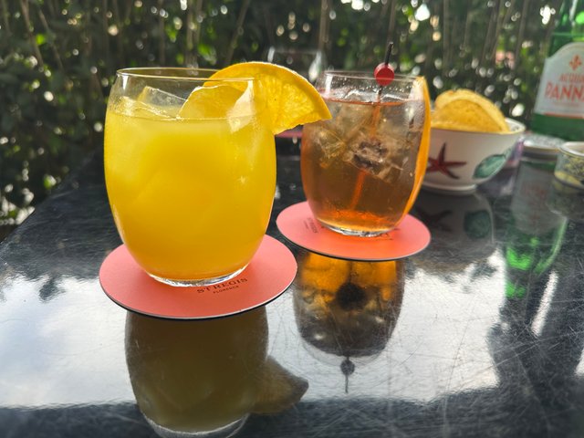 也许是时间很早,吧台并没有其他的客人。服务生让我们选位置坐,看到外面的气候并不热,我看到他们在户外有大雨伞篷下的位置,就选择了户外的位置。这样也可以看四处走动的路人。