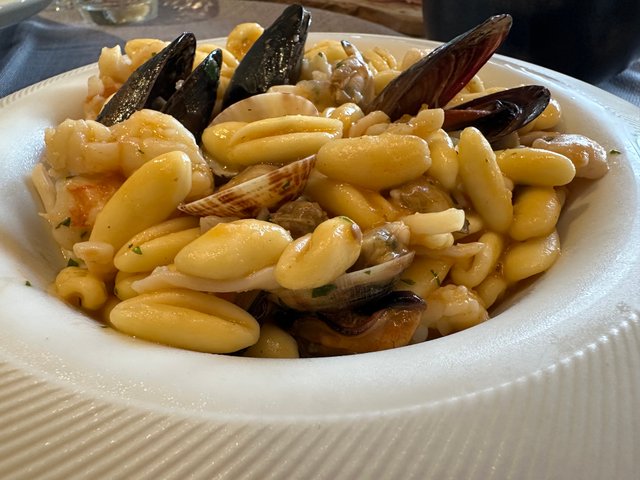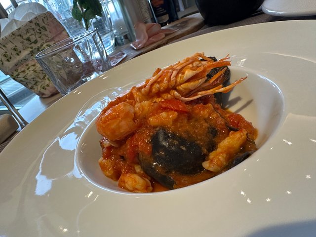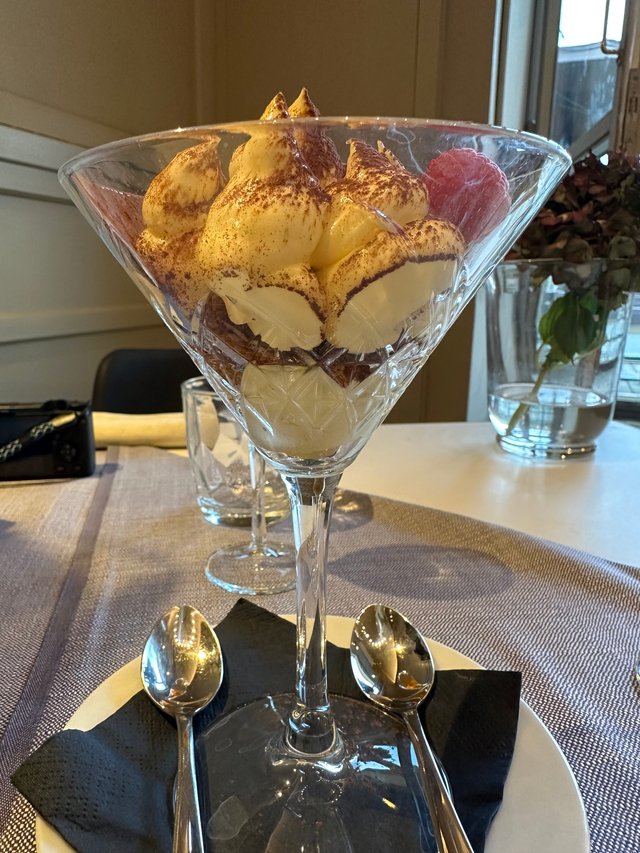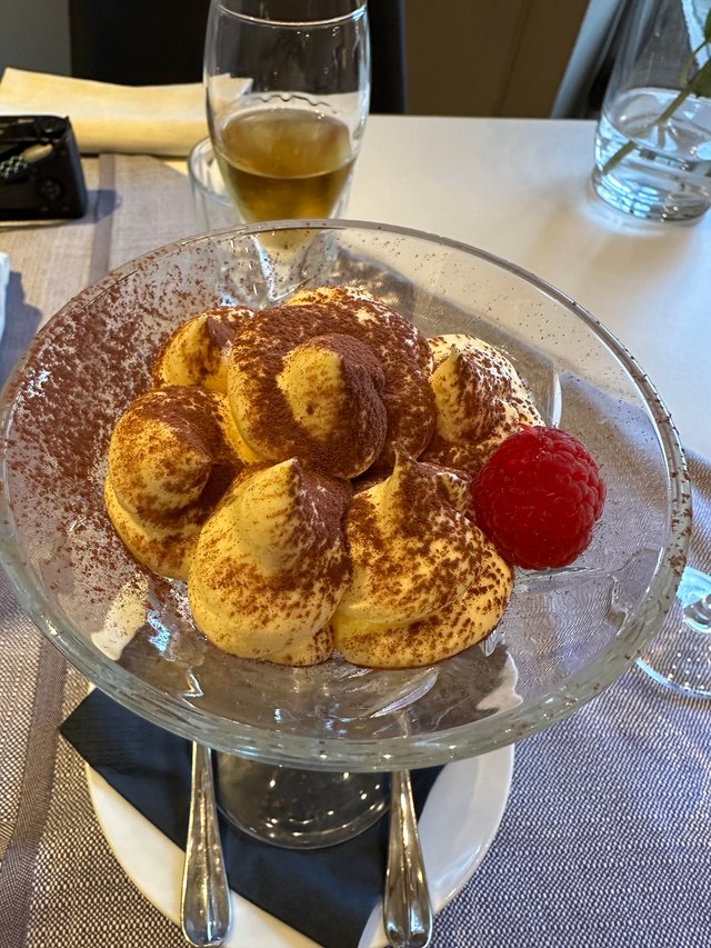 某生的主菜点了海鲜面,我的还是跟第一天点的一样。但是,虽然味道也不错,感觉没有第一天中午的时候那么惊艳。吃完主食后,问是否要吃甜点。原本我是不想吃的,但是某生说要有仪式感,就来份他们店里自制的提拉米苏。那味道确实很特别,值得点。