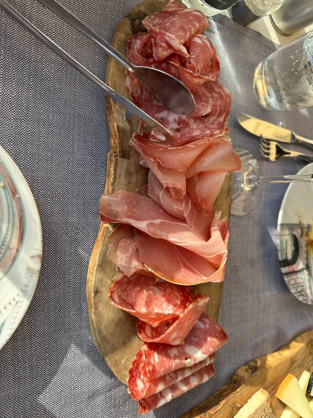 先来个熏火腿,意大利熏火腿是我比较喜欢的一道菜。平时在家里也经常买。我说尝尝本地的味道吧,看和我们平时吃的是否有什么不一样。那个Salami 的味道很不错,prosciutto 一般。