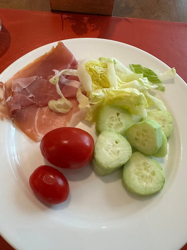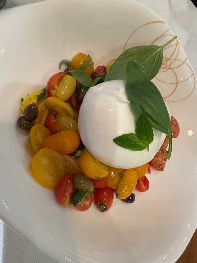 餐厅的桌上用红色的晒干的辣椒摆出一道造型,很经济,有点小特别。我们点了一道mozzarella 奶酪加西红柿。我的乖乖,等那道菜上上来,那mozzarella 奶酪真是巨无霸,还没见到这么大的奶酪球的。那小西红柿的味道还真是不错。可能是他们自己菜园里种的吧?很甜很新鲜。