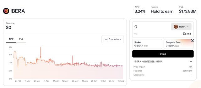 2025年下半年,iBERA的TVL趋于稳定,目前TVL为1.74亿美元,APR为3.24%。