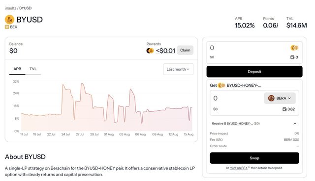iVault首个产品是BYUSD,存入 BYUSD-HONEY 两个稳定币交易对的LP,可以收获$iBGT等。可能的收益来源包括Berachain的POL、BEX以及额外激励。