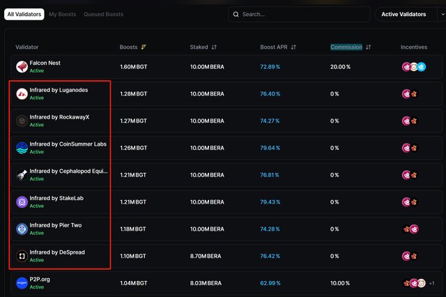 根据Berahub,Boost数量排名最高的验证者中,几乎大部分由Infrared的节点占据。