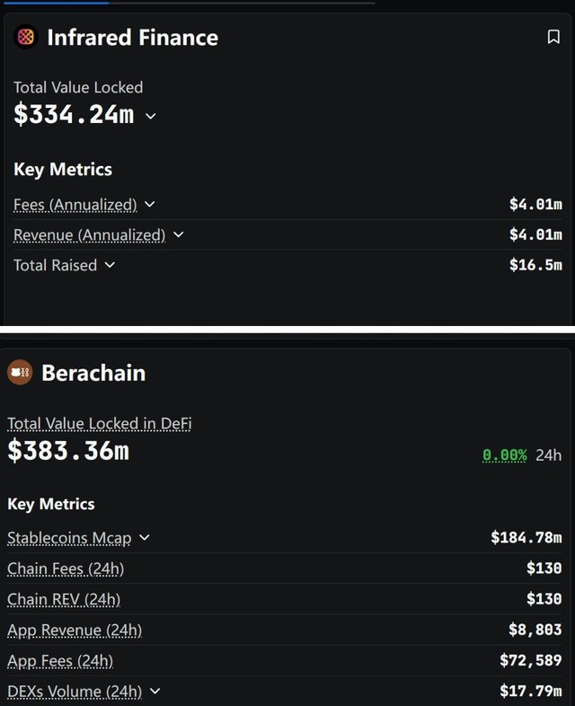 根据Infrared官网,平台总TVL达到5.33亿美元。Defillama使用不同的口径统计,Infrared的TVL为3.34亿美元,而同一口径统计Berachain生态总TVL为3.83亿美元。