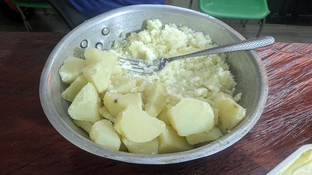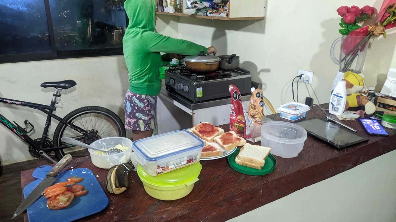 Empezó mi día desde la madrugada 🥴 al sonar la alarma ⏰ me levanté a preparar el desayuno a mi esposo para que se llevará al trabajo. Bueno, empecé montando una papas para sancocharlas, luego que estuvieran listas les agregué mantequilla y queso costeño rallado. Seguidamente prepare unos sandwich 🥪 rellenos con tomate, huevo, mortadela y salsa de tomate y eso fue todo lo que preparé y por supuesto yo aproveché y comí un poquito de las papas que había hecho. En la imagen pueden observar que el espacio donde estaba preparando el desayuno estaba un poco desordenado 🙆🏻♀️ pero es porque es un poquito pequeño el espacio 🤭 y bueno no podía faltar que me colocará un abrigo porque había frío.🥶