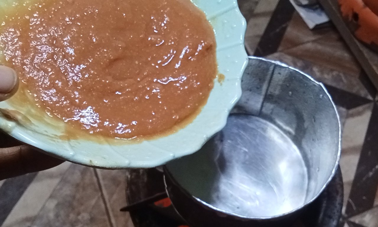 I transfer them into a Wash clean pot. I pour in half cup of water into the tomatoes and set up and light up my cooker.