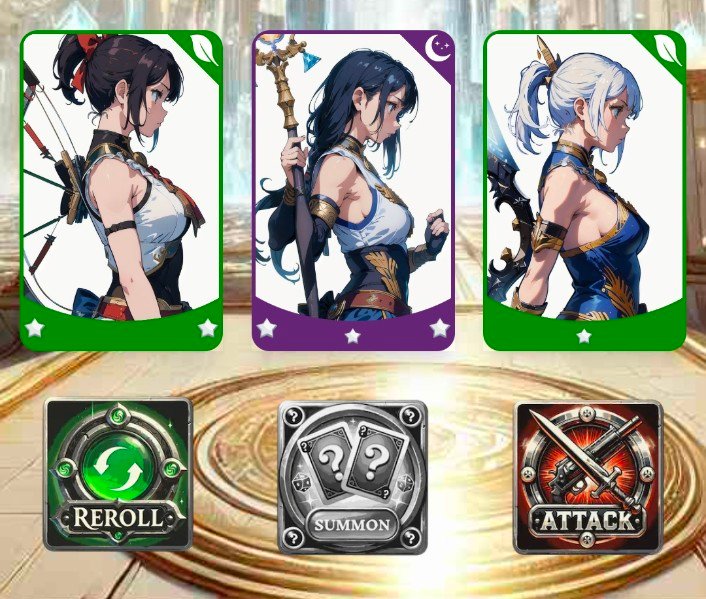 It is a very simple game to play, but fun. Here you can see Reroll, Sumon and Attack. So since I had five credits, I will open a Sumon. They will give me three cards. Let's see what those three cards bring.